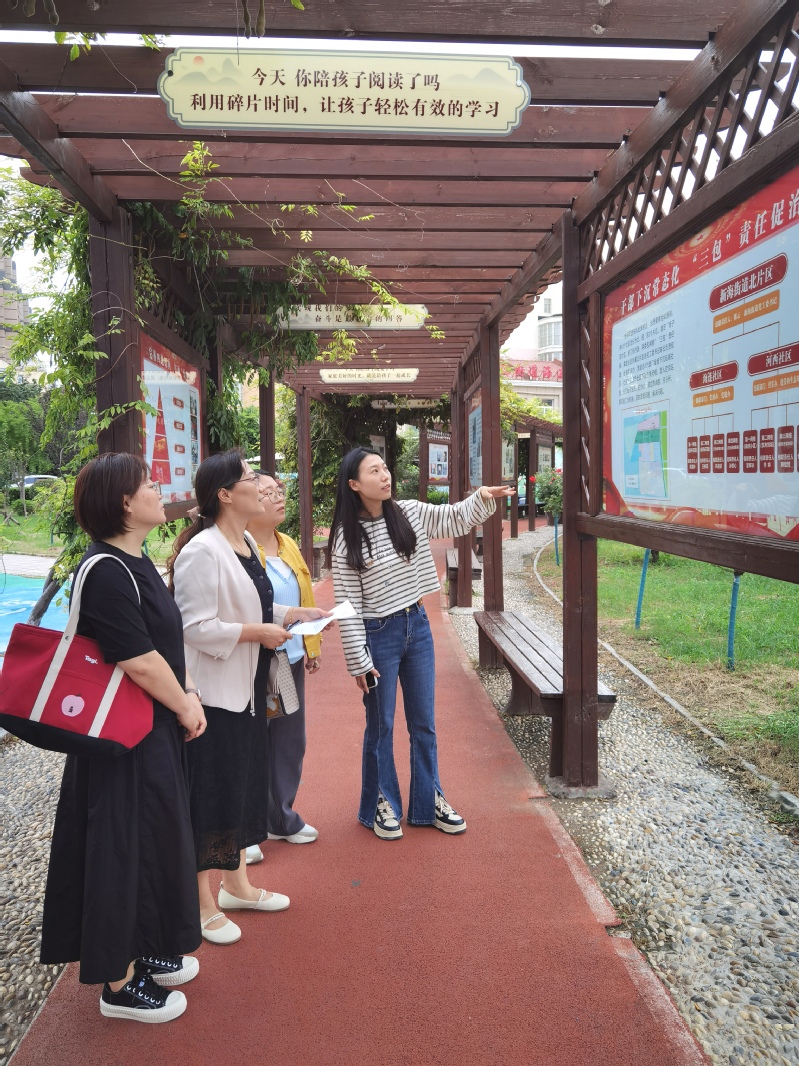 在海连社区居委会副主任汪修茹介绍和指引下,老师们实地参观了社区内的百穗餐厅、中医理疗、润心惠民水站、老年大学、居民健身区、儿童乐园等特色区域,近距离体验社区居民丰富多彩的生活和居民之间和睦相处的氛围。漫步在文化走廊,大家对社区“以居民为中心”的工作理念、“海连模式”党建引领有了更深刻的理解。海联社区,从管理到共治,用“红线”串起民心,书写新时代邻里党建基层善治新篇章。